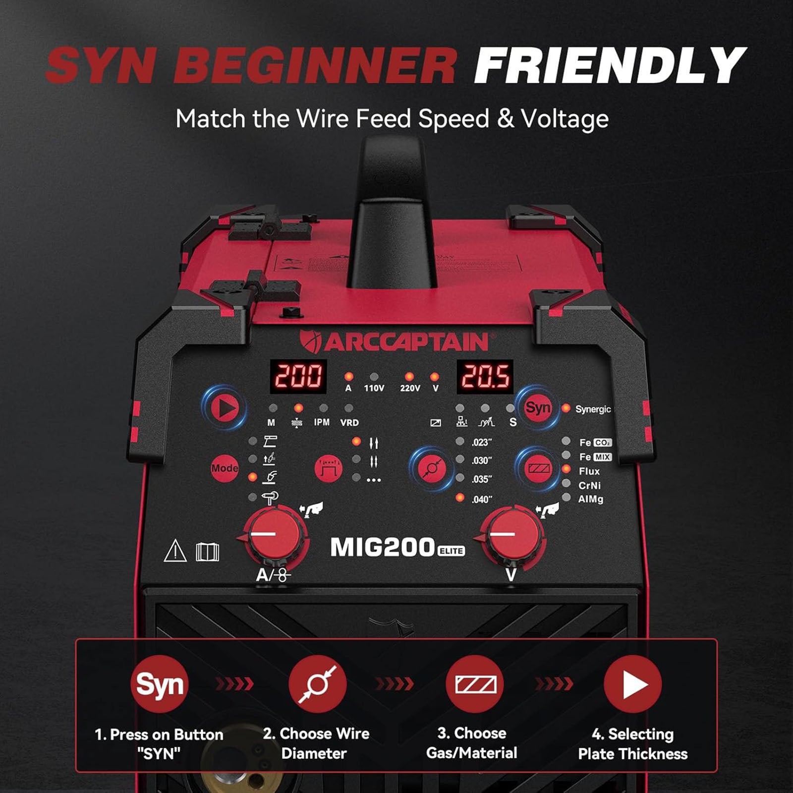 TECHNICAL UPGRADE: This welding machine features upgraded MCU and IGBT technologies, enabling users to precisely adjust parameters for Synergy MIG (plate thickness, voltage, welding speed), Manual MIG (current, voltage), and MMA (hot start, arc force, etc.) while its dual-voltage design (110V/220V) supports flexible power switching (Caution: Ensure the screen is off and the fan has stopped before changing voltage settings)