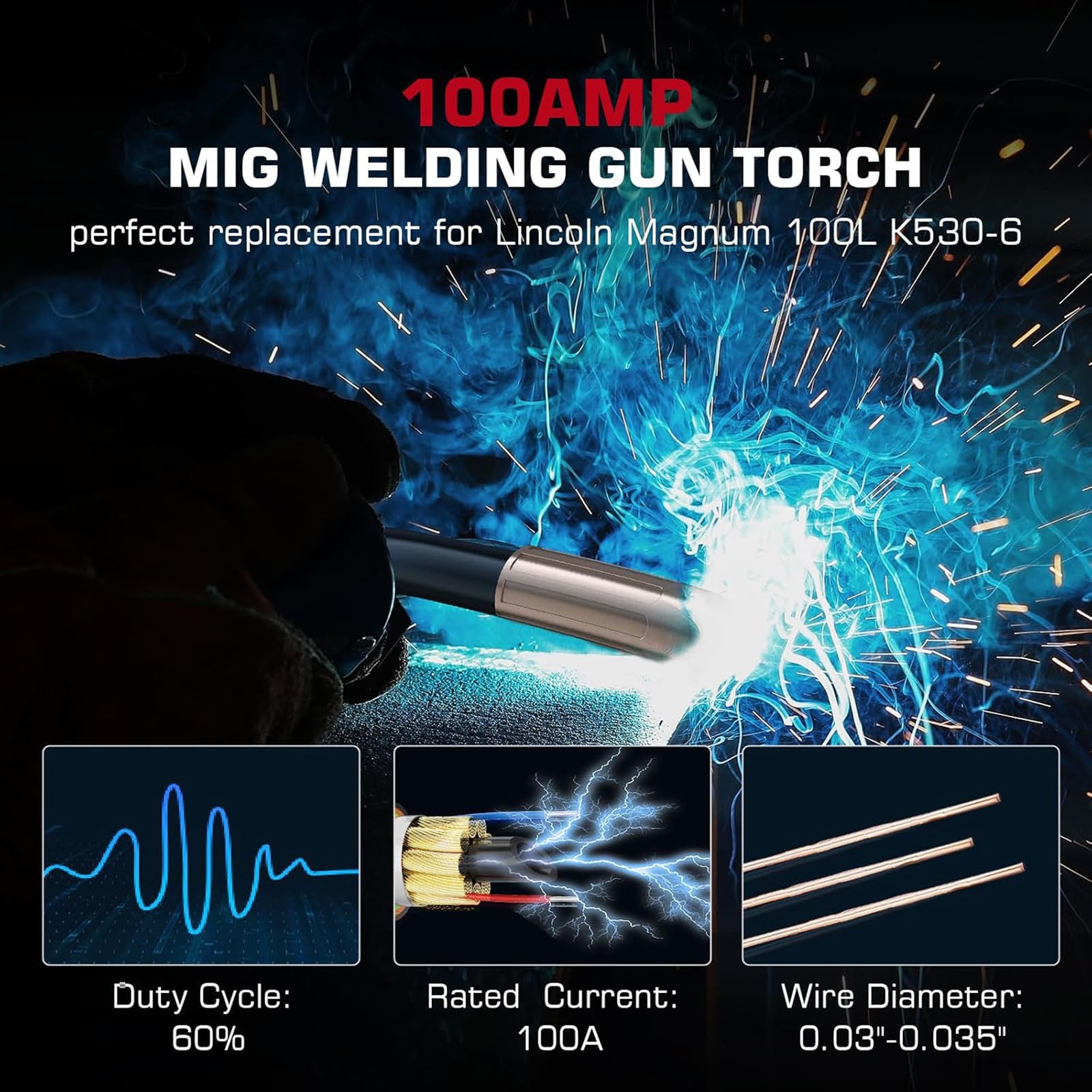 Superior Performance: Experience superior performance with our premium-quality 100Amp Lincoln replacement MIG gun stinger torch. Featuring a 10-foot (3m) cable, this torch is fully compatible with the Lincoln Magnum 100L (K530-5), ensuring seamless integration into your welding setup. Trust in its exceptional quality and enjoy enhanced welding capabilities for a wide range of applications.