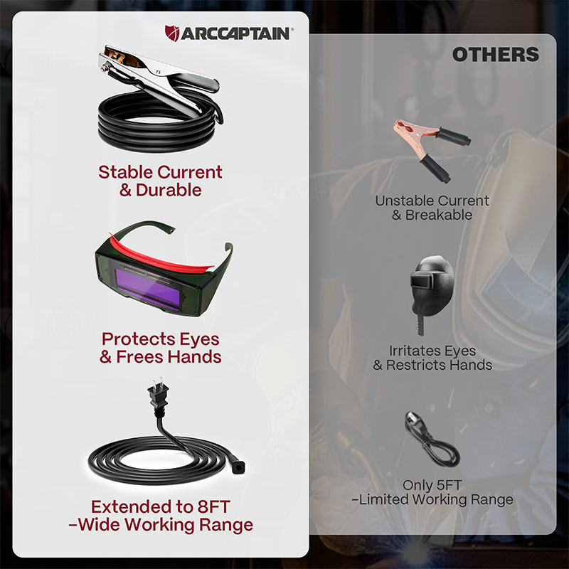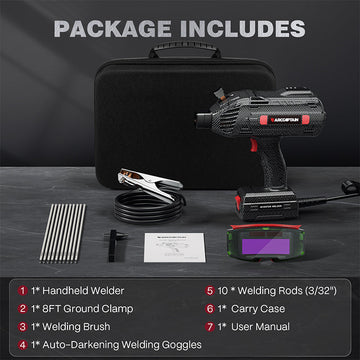 | Included Components | 10ft Ground Clamp, Brush & Hammer(for removing the dross), 10 * Welding Rods, Welding Goggles, Carry Case, User Manual |